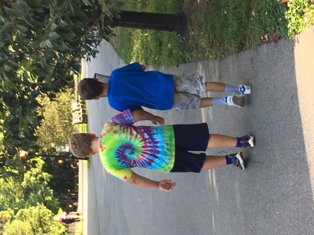 Walk home on riverside park from birthday party with Monte. Good shot of the famous tye dye shirt!